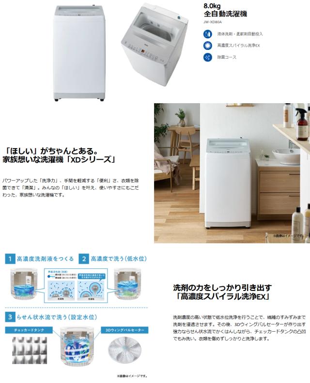 ハイアール 全自動洗濯機 洗濯8.0kg 簡易乾燥(送風機能) 洗剤柔軟剤自動投入 XDシリーズ JW-XD80A-W(標準設置無料)