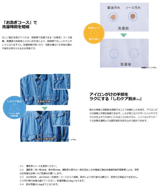 ※3 2019年8月、JW-CD55A「お急ぎ」コーステスト結果。条件により汚れ落ちは異なり、洗浄力の保証はできません。シミ汚れ等の洗濯は避けてください。洗濯容量は2.0kgとなります。